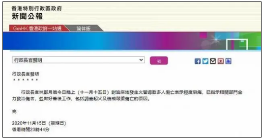 香港特區(qū)行政長官林鄭月娥15日晚上對油麻地發(fā)生火災(zāi)導(dǎo)致多人傷亡表示極度哀痛,已指示相關(guān)部門全力救治傷者,并做好善后工作,包括調(diào)查起火及造成嚴(yán)重傷亡的原因。