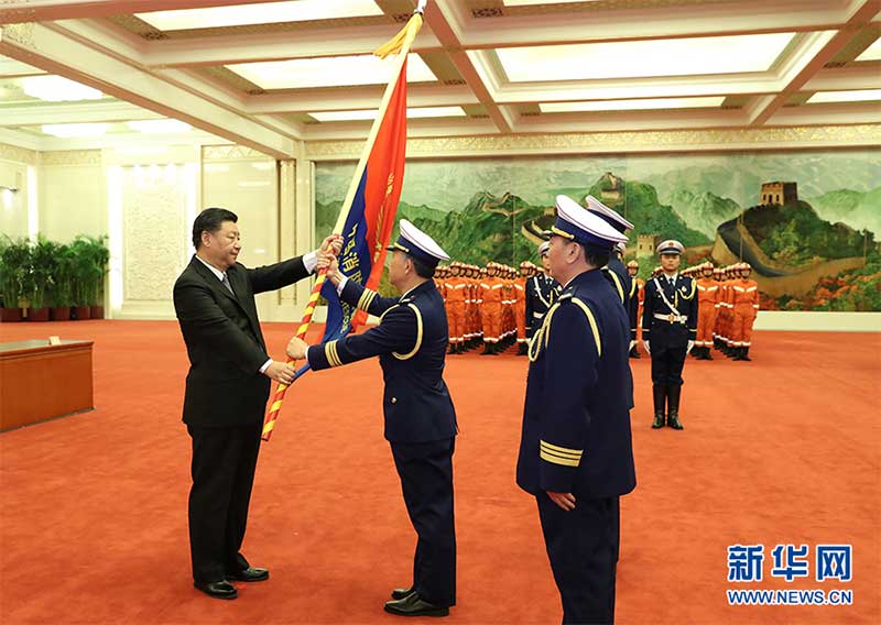 11月9日,國(guó)家綜合性消防救援隊(duì)伍授旗儀式在人民大會(huì)堂舉行。中共中央總書記、國(guó)家主席、中央軍委主席習(xí)近平向國(guó)家綜合性消防救援隊(duì)伍授旗并致訓(xùn)詞。這是習(xí)近平向國(guó)家綜合性消防救援隊(duì)伍授旗。 新華社記者 王曄 攝