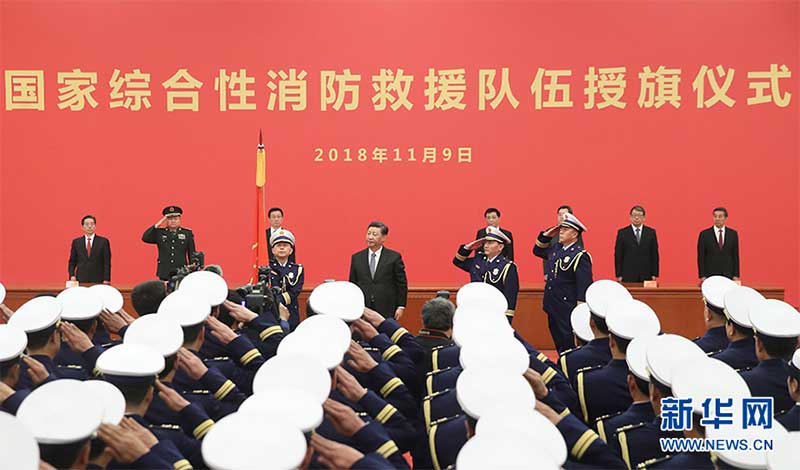 11月9日,國(guó)家綜合性消防救援隊(duì)伍授旗儀式在人民大會(huì)堂舉行。中共中央總書記、國(guó)家主席、中央軍委主席習(xí)近平向國(guó)家綜合性消防救援隊(duì)伍授旗并致訓(xùn)詞。 新華社發(fā)(盛佳鵬攝)