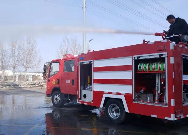 本次購置的消防車為江西玖發(fā)專用車有限公司生產(chǎn)的誼玖牌3.5T水罐消防車(GJF507XXXH型),主要功能為滅火供水、運送人員器材、提供火場照明。車輛載水量為3.5T,配置有消防水炮1個、出水口2個、吸水口1個、消防水槍2把、消防水帶5盤、破拆斧1把、上水鶴扳手2把、下水鶴扳手2把、滅火器1具、空氣呼吸器3個。其中消防水炮設計為直流與開花轉(zhuǎn)換功能,噴射流量20L/s,射程大于30米。出水口流量20L/s,射程大于35米。該車輛外廓尺寸較小,便于居民小區(qū)及農(nóng)村道路行駛,彌補了常規(guī)消防車輛外廓尺寸大,遇狹窄道路難以通行的弊端。