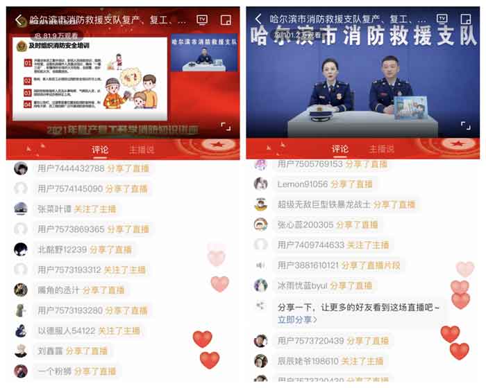 直播活動包括《2021年哈爾濱市消防救援支隊復(fù)產(chǎn)、復(fù)工、開學(xué)消防知識講座》、《2021年哈爾濱市消防救援支隊開學(xué)第一課》、播放火災(zāi)警示教育片等環(huán)節(jié)。消防宣傳員運用通俗易懂的語言,以現(xiàn)場講授、播放案例、互動問答等方式,詳細(xì)講解了企業(yè)復(fù)產(chǎn)復(fù)工消防安全管理和校園防火的知識要點。線上的觀眾互動也非常積極,紛紛提出自己想了解的防火知識,消防宣講員都一一進(jìn)行解答。據(jù)統(tǒng)計,這次網(wǎng)絡(luò)直播觀看人數(shù)達(dá)120余萬人次。